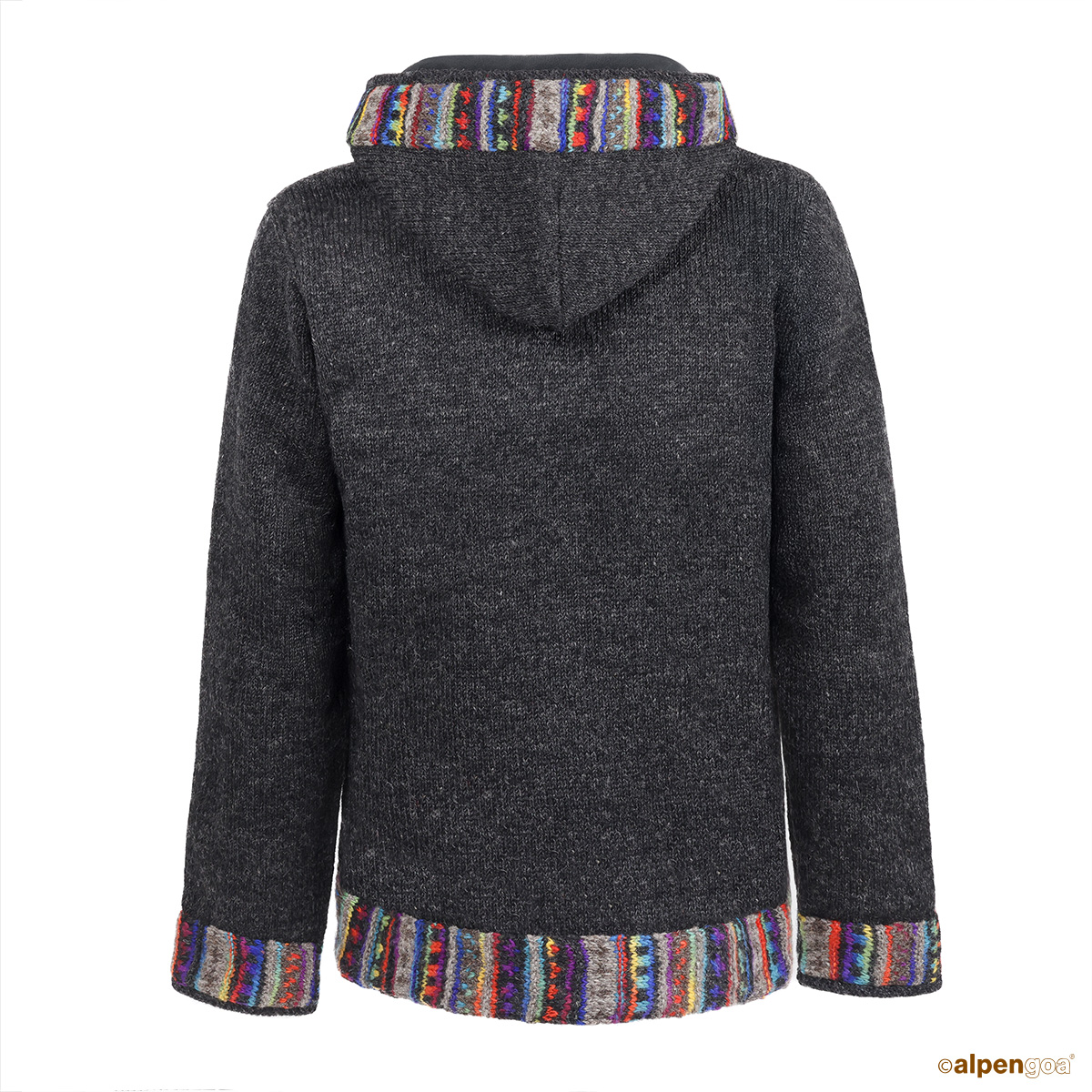 Die farbenfrohen Borten an Kapuze, Ärmeln und Bund erzählen von Handwerkskunst und Individualität.